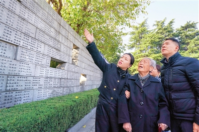 图为南京大屠杀幸存者艾义英(右二)和家人在南京大屠杀遇难同胞纪念馆的“哭墙”上寻找家人姓名。