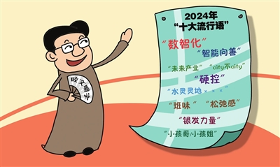 近日,《咬文嚼字》发布2024年“十大流行语”,引发网友热议,“数智化”“班味”“松弛感”等反映当下生产生活状态的词语纷纷上榜。有人说,语言是社会的一面镜子,今年的流行语折射出的时代特征十分鲜明。 孟宪东 画