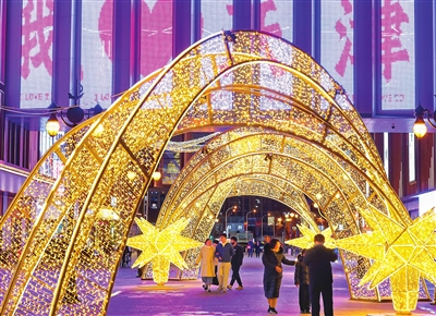 夜晚的和平区金街灯光璀璨,吸引游客驻足观赏。 本报记者 吴迪 摄