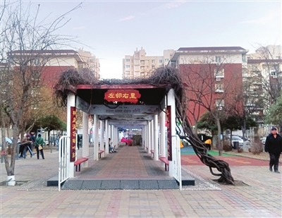 记者近日到艳泉里社区采访。社区花园内,有老人在长廊下促膝聊天,有孩童在玩滑梯。长廊上面写着邻里和睦、崇德向善内容的古诗词,长廊门头上“左邻右里”几个大字,很好地诠释了邻里和睦的场景。