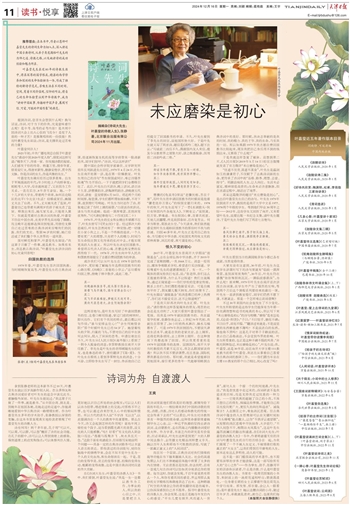 这不是一部门槛很高的学术著作,也不需要有深厚的学养才能读懂,这是一部写给所有人的“交心之作”——作为学生、助手,张静用平实的话语告诉读者,什么是诗教、什么是叶嘉莹先生的诗教人生。书里有一枚荷花图案的小书签,和封面上的一池荷花遥相呼应:碧波荡漾处,一位身着长裙的女士正撑着竹筏在荷花丛中穿行而来。那发型、那衣着,会让人一眼看出:是叶嘉莹先生!她以这艘诗词的小舟,驶过百年岁月,承载离乱悲欢,渡自己、也渡我们每个人。(本版照片由张静提供)