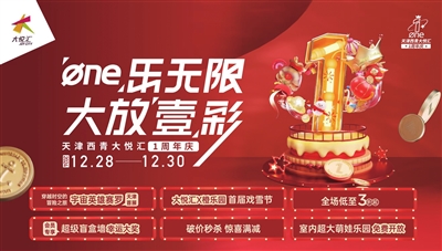 本次周年庆活动期间,天津西青大悦汇将围绕“one乐无限·大放壹彩”的主题,在引入、共创、原创等多个层面展开积极探索,融入全民IP、互动NPC、儿童剧、戏雪、盲盒等元素,为消费者带来源源不断的惊喜。