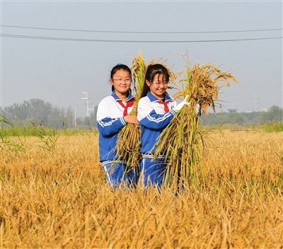 杨明星的想法与李明波不谋而合。刚刚过去没多久的丰收季,东丽区东羽小学的小学生们来到军粮城街道四村股份经济合作社的水稻种植基地,亲身体验了一把水稻收割的乐趣。