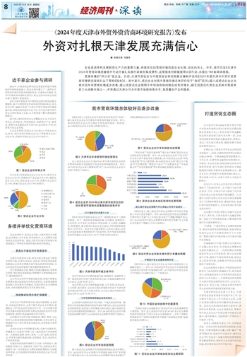 营商环境的“评分员”是企业。日前,天津市贸促会与中国贸促会研究院联合编制并发布《2024年度天津市外贸外资营商环境研究报告》(以下简称《报告》)。其中显示,受访企业对我市营商环境总体评价位于“良好”区间;超八成受访企业认为我市近年来营商环境逐步改善;超七成受访企业预期今年利润将保持稳定或有所增长;超五成受访外资企业反映中国是其前三大战略市场之一,并将通过天津公司为中国市场提供高水平、高质量的产品和服务。
