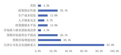 “天津公司是企业战略重点”是受访外资企业在津增资的主要原因。其中,近九成受访外资企业(87.0%)表示在天津增加投资的原因是“天津公司是企业战略重点”。此外,“预期市场增速加快”“预期市场盈利水平提高”“政策稳定性强”也被较多提及(如图11)。