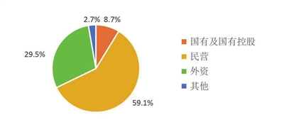 从企业类型看,民营企业占比59.1%,外资企业占比29.5%,国有及国有控股企业(以下简称国有企业)占比8.7%,其他所有制企业占比2.7%(如图1)。