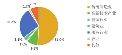 从行业看,传统制造业企业占比51.0%,服务行业企业占比26.2%,高新技术产业企业占比9.5%,建筑业企业占比3.1%,农业企业占比1.7%,资源行业企业占比1.0%,其他行业企业占比7.5%(如图2)。