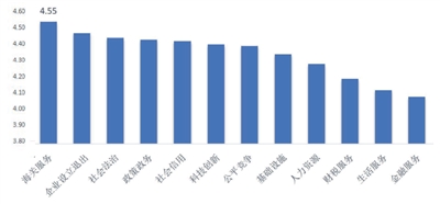 《报告》的评价指标体系由12个一级指标和55个二级指标组成。12个一级指标包括基础设施、生活服务、政策政务、社会信用、公平竞争、社会法治、科技创新、人力资源、金融服务、财税服务、海关服务以及企业设立退出,评价指标取值范围为1分至5分。受访企业对海关服务、企业设立退出、社会法治及政策政务等指标给予了较高评价,其中对海关服务指标的评价最高,达到4.55分,位于“优秀”区间(如图5)。