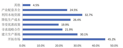 “开拓市场”“利用本地资源”“建立生产基地”是受访企业在津投资的首要因素。其中,45.2%的受访企业将“开拓市场”作为在天津开展投资的主要因素,32.7%的受访企业将“利用本地资源”作为主要因素,30.1%的受访企业将“建立生产基地”作为主要因素。“降低生产成本”“产业配套齐全”“寻求战略合作”“享受优惠政策”等因素也被较多提及(如图8)。