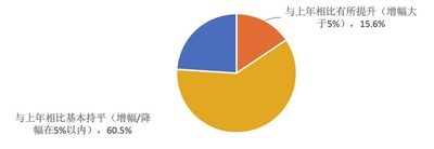 《报告》显示,超七成受访外贸企业预期今年外贸订单量较上年持平或有所提升。其中,60.5%的受访外贸企业预期本年度外贸订单量“与上年相比基本持平”(增幅/降幅在5%以内),15.6%的受访外贸企业预期本年度外贸订单量“与上年相比有所提升”(增幅大于5%)(如图9)。