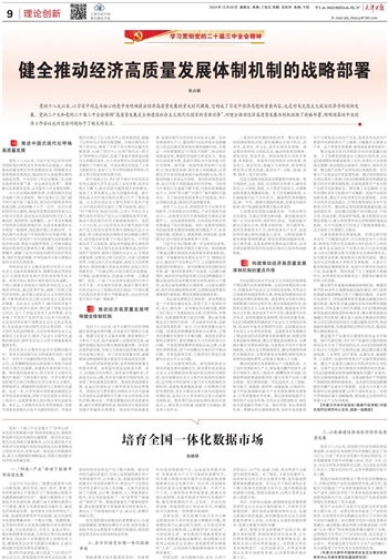 党的二十届三中全会提出了“培育全国一体化技术和数据市场”的改革发展目标,数据资源是数字经济发展的关键要素。数字经济是以现代信息网络为重要载体、以信息通信技术有效使用为效率提升和经济结构优化的重要推动力的经济活动,培育全国一体化技术和数据市场,真正实现数据的顺畅流动,将极大推动数字经济的高质量发展。