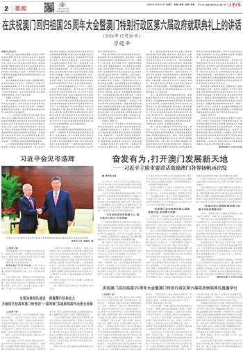 新华社澳门12月20日电(记者 梅常伟)出席庆祝澳门回归祖国25周年活动的中共中央总书记、国家主席、中央军委主席习近平,20日视察中国人民解放军驻澳门部队,代表党中央和中央军委向驻澳门部队全体官兵致以诚挚问候。他强调,要深入贯彻新时代强军思想,贯彻新时代军事战略方针,全面加强部队建设,全面提高履行防务能力,发挥好定海神针作用,为继续开创具有澳门特色的“一国两制”实践新局面作出更大贡献。