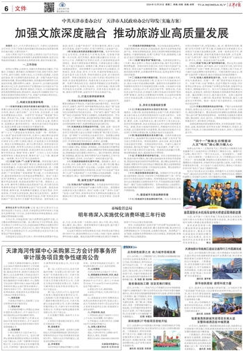 本报讯 近日,中共天津市委办公厅、天津市人民政府办公厅印发了《关于加强文旅深度融合推动旅游业高质量发展的实施方案》,主要内容如下。