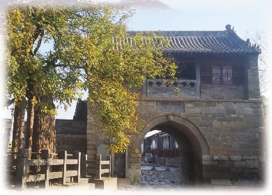 土门关现存阁楼三座:东土门西阁,西土门东阁、西阁。东土门西阁即建平家门口这个。阁楼分上下两层,底层由青石垒砌,上面是砖木结构的殿宇,中间是拱券门洞,上方匾额刻有“三省通衢”几个大字。门洞的路面铺有石板石块,已凸凹不平,光滑发亮,有两道深深的车辙印清晰可见。从门洞的宽度看,通过小轿车是没有问题的。这座关楼重建于清康熙二十一年(1682),雍正八年(1730)部分重修。靠墙有两通石碑,其一上刻“镇威述先阁碑记”。阁楼左侧有一棵树龄六百年的老槐树,上溯一下时在明初。古槐树冠庞大,有数根柱子支撑着枝干,细密的叶子驳杂着枯黄,但绿意依旧深郁。老槐树与古关阁相得益彰,分外适配,默默宣示着光阴的幽远与沧桑。