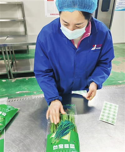 工作人员将新鲜的韭菜打包并贴上溯源二维码。