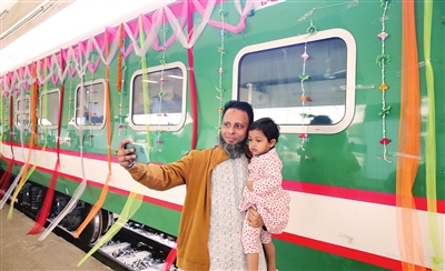 12月24日,在孟加拉国首都达卡,人们在帕德玛大桥铁路连接线列车前自拍。中国企业承建的孟加拉国最大铁路项目帕德玛大桥铁路连接线24日全线通车,正式运营。 新华社发