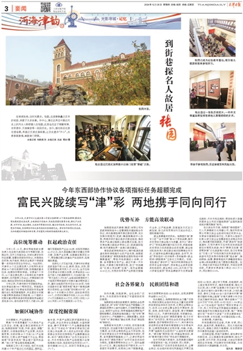 在深化人才交流方面,天津市向甘肃省选派党政干部124名,教师、医生、农技、园区管理等各类专技人才1253名,全方位助力甘肃省乡村振兴发展,甘肃省派出1463名干部人才赴津跟岗学习,为当地打造一支“带不走的人才队伍”;全面启动教育医疗人才组团式帮扶国家乡村振兴重点帮扶县工作,填补当地医疗技术空白500余项,与结对县联手打造“周恩来班”等多个教育品牌和示范学校;全力实施“百村振兴计划”,共建126个乡村振兴示范村,启动各类项目154个,示范村村集体平均收入从2021年的17.8万元提高到40.8万元,村民人均收入从2021年的1.09万元提高到1.65万元。