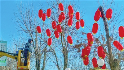 图为在西青区大寺镇龙居公园一侧,工作人员正在布置喜庆的红色灯笼。