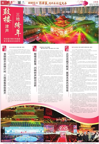 以墙为幕,投射发展成就,寄望美好新年;鼓楼钟声,旧岁余韵不绝,敲响有为新章;三地同庆,融合文旅资源,共创协同发展。昨晚,2025天津“鼓楼津声”跨年系列活动在南开区鼓楼广场举行,炫目的灯光秀与夜景演出轮番上演,共庆新年到来。同时,今年也是京津冀三地首次联动举办跨年活动,北京首钢园、天津鼓楼广场和河北正定古城三地会场携手同庆迎新年,用直播互动形式寄语新春,传递祝福,共谱美好明天。