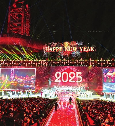 “跨年喽……”随着2025年新年钟声响起,由数百架无人机组成的“新年快乐”图案瞬间照亮夜空,现场欢呼声响成一片。