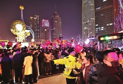 随着夜色渐深,昨晚9时许,天塔风景区周边的人流量和车流量较日常倍增,《AI·如梦令》跨年裸眼3D光影秀等精彩活动正在此上演,人们纷纷举起手机拍摄这“空中美景”。“大家往便道上站,注意安全!”交警河西支队东风里大队警长连捷耐心地提醒围观的人们,和她一起执勤的还有多名女警。“交警姐姐辛苦了,新年快乐!”人群中,一名四五岁的男童奶声奶气地向她们送出祝福。“不辛苦,小家伙!”连捷笑着摸了摸孩子的头,继续忙碌起来。虽然不能与家人共度佳节,但她们却用自己的方式送上了一份特别的“津味儿”平安跨年祝福。
