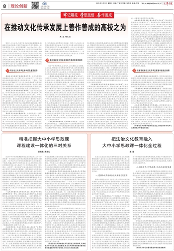 一是加强党对高校文化建设的领导。坚持党对高校的全面领导,必然要求加强党对高校文化建设的领导。高校党委要从贯彻习近平文化思想、坚持党的文化领导权的高度,把加强文化建设摆在突出位置抓紧抓实。要深学深用习近平总书记视察天津重要讲话精神,从落实“四个善作善成”重要要求的政治责任出发,更加自觉主动地推动文化传承发展。