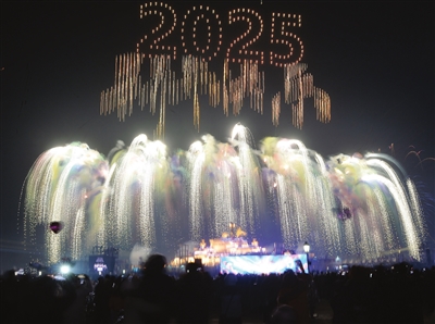1月1日0时,位于中新天津生态城的泰达航母主题公园“跨年烟花许愿夜”活动拉开大幕。4万发蓝色、金色、红色、紫色的烟花如约绽放,近千架无人机缓缓升空,带来一场“科技+艺术+音乐”的视听盛宴。