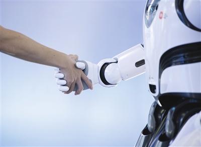 在深圳市优必选科技股份有限公司总部,工作人员与熊猫机器人“优悠”握手。