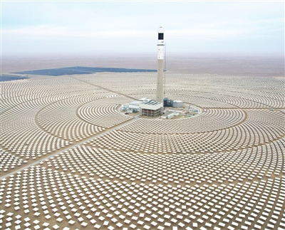 甘肃省酒泉市金塔县白水泉光电产业园内,建设中的金塔中光太阳能“光热+光伏”试点项目。