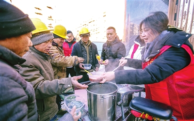 南开区长虹街幸福南里社区携手爱心商户,把腊八粥送到工地。