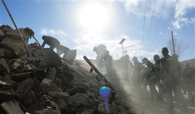 1月7日,救援人员在定日县长所乡古荣村进行搜救。 新华社发