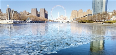 2025年1月8日,近几日气温骤降,海河河面开始封冻,逐渐冰封的水面上,片片浮冰倒映河畔景物,有如拼图一般。