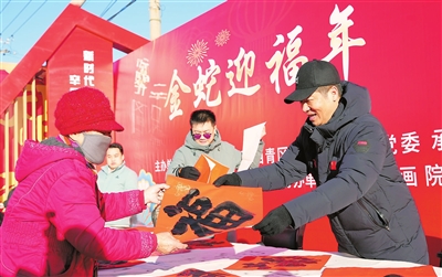 天津西青区第六埠村,书法家为村民写福字。 本报记者 赵建伟 摄