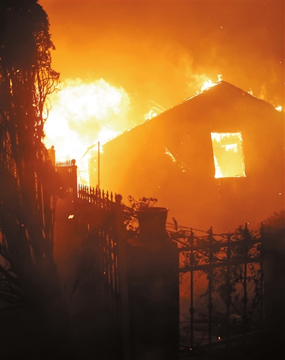 在美国加利福尼亚州南部洛杉矶县沿海社区帕西菲克帕利塞兹,野火吞噬房屋。 新华社发