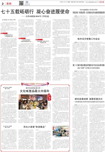 回首2024,在全国政协有力指导和中共天津市委坚强领导下,市政协坚持以习近平新时代中国特色社会主义思想为指导,坚持党的领导、统一战线、协商民主有机结合,坚持发扬民主和增进团结相互贯通、建言资政和凝聚共识双向发力,把加强思想政治引领、广泛凝聚共识作为履职中心环节,共同思想政治基础不断巩固,协商议政内容和形式更加丰富,民主监督工作取得实效,政协工作制度化、规范化、程序化持续推进,政协“两支队伍”建设不断加强,留下守正创新、务实奋进的铿锵足音。