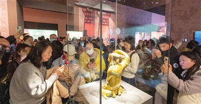 “太火了!就没排过这么长的队。”尽管夜幕降临,在天津博物馆门前,入口处核验身份证排队安检的观众依旧络绎不绝。元旦开始,“天开一统——秦汉文物”主题展在天津博物馆开展,展览汇聚了来自天津、河北、河南、陕西等11地16家文博单位所藏文物精品。河北博物院的“镇馆之宝”长信宫灯“出差”到天津,瞬时成为顶流,不少市民专程而来,希望一睹“中华第一灯”的风采。为了尽量满足大家的观展诉求,天津博物馆还特意延后了闭馆时间。
