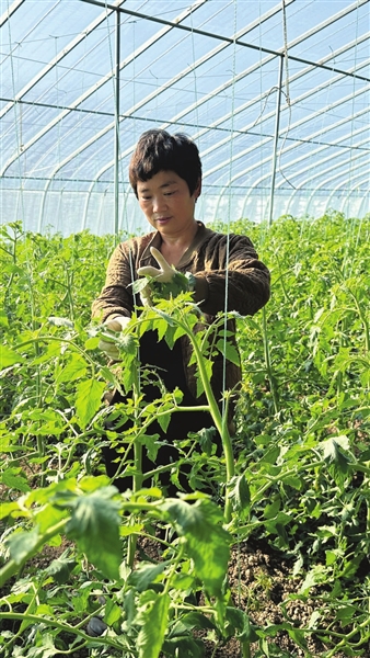 甄营村的现代设施种植标准化园区的温室里,西红柿植株长势喜人,种植户在为西红柿植株扶苗。