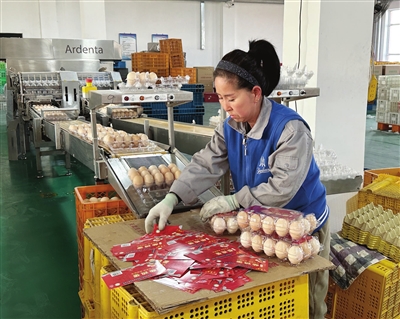 9点多,产蛋鸡舍里的自动收蛋设备开始运转,按顺序将每个养殖舍的鸡蛋输送到公司包装车间一楼的全自动分拣设备上。“我们这套自动清洗、杀菌、分拣设备是从国外引进的顶级专业设备,它能精准挑出人工不能辨别的破损的鸡蛋,将完好的鸡蛋根据不同重量送入不同的通道自动装盒包装,工人们只需要贴好标签,进行装箱即可。”张春洪说着,随手拿起一盒已经包装好的鸡蛋告诉记者,“你看,这一盒的标准重量是650克,10枚鸡蛋,每个鸡蛋的克重相差不到2克,要是靠人工去分拣的话,不仅速度慢,而且每个鸡蛋的克重也不好把握。”记者看到,在分拣车间里不过十几分钟,几十筐鸡蛋就已装箱完成,门外的运输车也准备就绪,这意味着从养殖场到餐桌,每一枚鸡蛋都是直供,确保了鸡蛋新鲜、安全、健康。