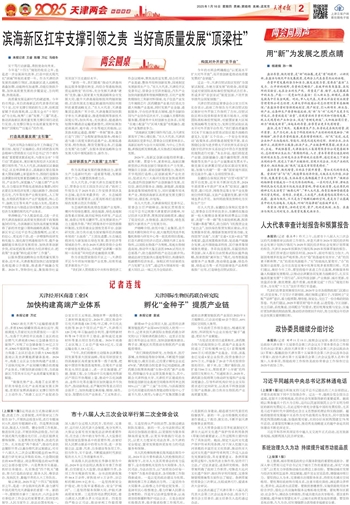 “这次市两会为做好全年工作确定了发展目标、规划了实施路径,我们将把落实两会精神与贯彻落实习近平总书记‘四个善作善成’重要要求联系起来,与落实全市‘十项行动’贯通起来,更好地发挥经济大区的支撑引领作用。”市人大代表,滨海新区区委副书记、区长单泽峰表示,滨海新区要在服务重大国家战略上彰显新作为,围绕打造服务京津冀协同发展重要战略支点,紧盯创新协同、产业协作,深度融入“六链五群”产业布局,合力建设世界级先进制造业集群;同时还要在实体经济发展上闯出新路子,推动绿色石化、汽车等优势产业焕发新机,人工智能、生物医药等新兴产业扩能提质,核心芯片、脑机交互等未来产业抢占先机,促进生产性服务业与制造业协同集聚,打造以实体经济为支撑的现代化产业体系。