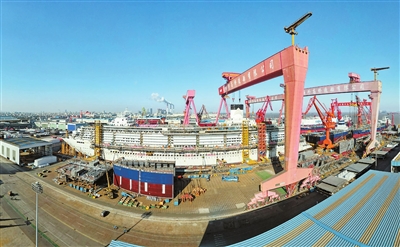 1月15日,第二艘国产大型邮轮H1509船(“爱达·花城号”)在中国船舶集团有限公司旗下上海外高桥造船有限公司2号船坞内实现全船贯通,全面转入全船内装工程、设备、系统调试“下半场”。相比于首艘国产大型邮轮“爱达·魔都号”,“爱达·花城号”总吨位增加了0.64万吨达14.19万吨,总长增加17.4米达341米,客房数量增加19间达2144间,满载游客量5232人,配置高达16层的庞大上层建筑,增加更具体验感和娱乐化的相关设施。 新华社发