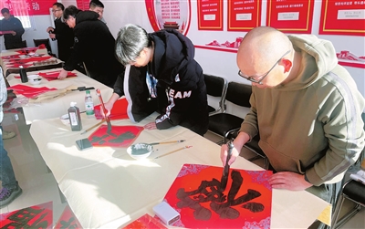 “金龙含珠辞旧岁,银蛇吐宝贺新春”“欢天喜地庆佳节,张灯结彩迎新春”“爆竹千声辞旧岁,红梅万点迎新春”……一幅幅饱蘸浓墨、满含深情的“福”字和春联自书画家笔下挥洒而出,字体或洒脱疏放,或端庄俊秀,彰显深厚的艺术功底。