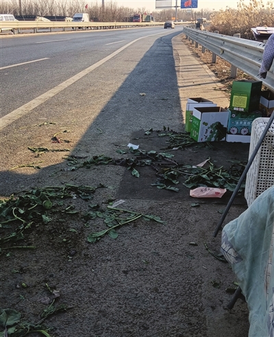 京岚线靠近独流减河特大桥一带,路边卖萝卜造成的隐患更多。因为两侧安装有一米多高的护栏,机动车为了避免与护栏剐蹭,只能更多占用机动车道停车。与此同时,卖萝卜的摊主摆摊各有“奇招”:有的推着电动三轮车停在非机动车道上售卖;有的借助护栏搭建“柜台”,坐在护栏上招呼过往的车主;有的甚至直接将萝卜码放在路面,挑选萝卜需要蹲在路边。每个摊位前都散落着随意丢弃的萝卜缨子。一位摊贩告诉记者,这些萝卜缨子不能轻易收拾:“摆在这儿就是为了告诉后边的人,我的萝卜卖得火。”