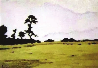 明信片正面画的是一幅水彩画《沼津风景》。画中,在光的照耀下,海水呈现一线白光,稻田为黄绿色,斑斓的色彩和随意的笔触组成一幅多姿多彩的画面,把沼津的山、海水、树木、田野描绘得异常动人。这幅画可谓我国早期水彩画的代表作。