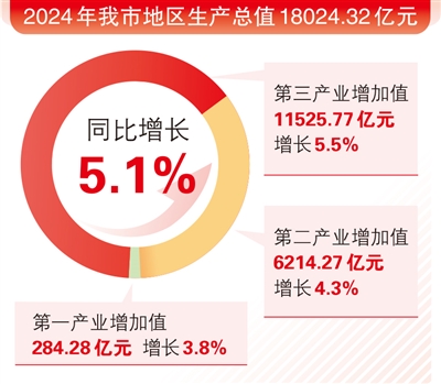 本报讯(记者 马晓冬)记者从市统计局获悉,2024年,我市生产供给稳中有升,市场需求基本平稳,全市经济运行呈现稳中向好的发展态势。根据地区生产总值统一核算结果,去年我市地区生产总值为18024.32亿元,按不变价格计算,比上年增长5.1%,增速比上年加快0.8个百分点。其中,第一产业增加值284.28亿元,同比增长3.8%;第二产业增加值6214.27亿元,增长4.3%;第三产业增加值11525.77亿元,增长5.5%。