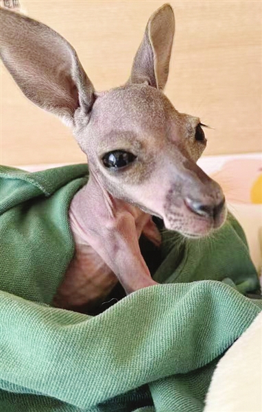 2024年6月,一只11岁的雄性赤大袋鼠与一只7岁的雌性赤大袋鼠生了一只赤大袋鼠,起名为“鹌鹑蛋”。之前,这只7岁的雌性赤大袋鼠养育着一只不足1岁的幼仔,没想到这只幼仔于约3个月后,即8月29日,把“鹌鹑蛋”挤出了妈妈的育儿袋。野生动物饲养员发现时,“鹌鹑蛋”体重300克、体长12厘米,身上仅长有绒毛,存在生存危险。它用一双水汪汪的小眼睛看着饲养员,饲养员把“鹌鹑蛋”抱进袋鼠馆舍,保持适宜生活温度18摄氏度至26摄氏度。从此,饲养员成了“鹌鹑蛋”的“妈妈”,为仿生人工育幼环境,为它购买了细长奶头并进行消毒,然后把奶头安装在注射器上,在注射器里装上适温的羊奶,采取注射方式喂养“鹌鹑蛋”。为让“鹌鹑蛋”生活在育儿袋里,饲养员买来棉绒料仿生育儿袋系在身前,再把“鹌鹑蛋”装进袋里,让它生活在仿生母体育儿环境中,感受“母体”的温暖和慈爱。