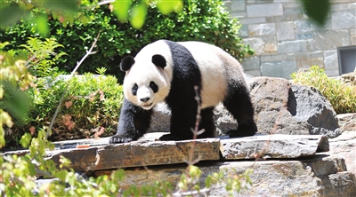 图为大熊猫在澳大利亚阿德莱德动物园玩耍。