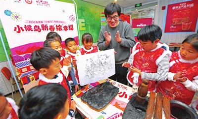 天津杨柳青年画业协会副会长、义成永木版年画传承人杨鹏指导孩子们勾、刻、印、绘……“小候鸟”们赏非遗、迎新春,动手画出新春美愿。