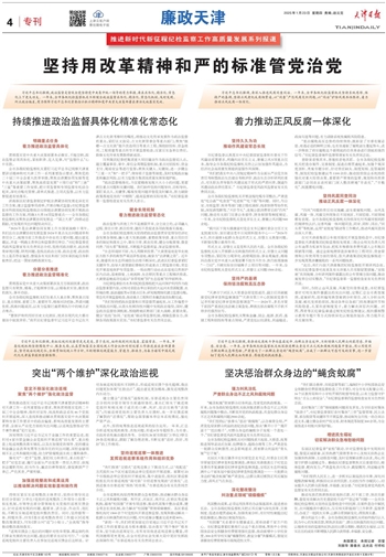 滨海新区纪委监委制定护航京津冀协同发展走深走实工作方案,建立监督事项清单,开展台账式监督;市纪委监委驻市科技局纪检监察组出台围绕京津冀协同发展开展政治监督的工作方案,明确3大类14项监督重点……全市各级纪检监察机关聚焦京津冀协同发展这一“国之大者”,持续动态跟踪,对发现的突出问题坚决纠正。