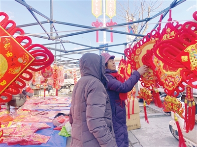 无论身在哪个大集,最能烘托年味儿的,无疑是那些售卖节庆挂饰的摊位。春联、吊钱、窗花、灯笼和中国结,散发出红彤彤的喜庆气息,火红的景象将年味儿“拉满”,也最容易触动人心。