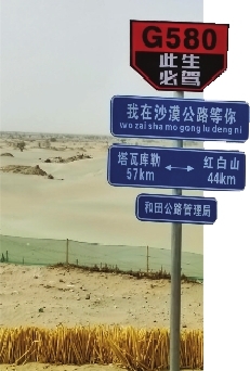 不久前,我和几位朋友驱车来到南疆,准备穿越这片沙漠时,心里非常激动。车在580国道上行驶,这是一条从阿拉尔市到和田的沙漠公路,全长有400多公里。此时,我比两天前行走在天山独库公路时还要兴奋。车开过塔里木河大桥,马上进入沙漠,路两旁的树木和草渐渐稀少了,周围的颜色一下子变得单调了许多,四周是一望无际的沙漠,荒无人烟。我坐在副驾驶的位子上,前方的景色一览无余。眼前的公路,像一条深灰色的绸带飘向远方,也将我的思绪带向大漠深处……想起古时候穿行在大漠之中的商旅,他们将脚印深深印在大漠里,驼铃声在旷野里回荡,后面留下寂寞的身影……